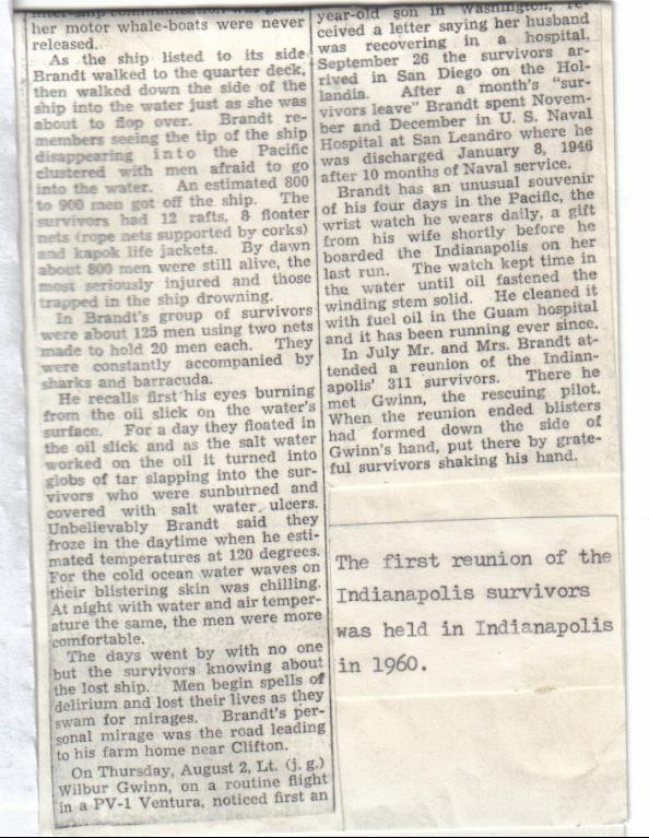 I came across this particular site, by accident. I have found several books on the sinking of the Indianapolis, and have purchased at least 2, which have been very interesting. I have been looking for additional information on Russell "Rusty" Brandt.....I am related to Rusty through marriage to his wife Rita.....so, you and I are also cousins. Your Dad, Tom, and I went to high school together, though I think I am about 3 years older than he is. We were in band together, and played coronet. We sat next to each other. I have been wanting to get in touch with him, but had no idea where he had moved. I would have sent you just an e-mail, but did not know how to do it from this site. Anyway, I hope we can correspond. I was so happy that you posted the interview that your grandfather gave to the Clifton paper. I had not been able to find that.
