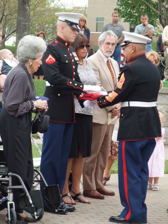 In the picture below, Giles' wife was presented with the Flag of the United State of America which flew over the USS Indianapolis Memorial, and his grandson, a United States Marine, was presented with the Marine Corps flag which also few over the Memorial.